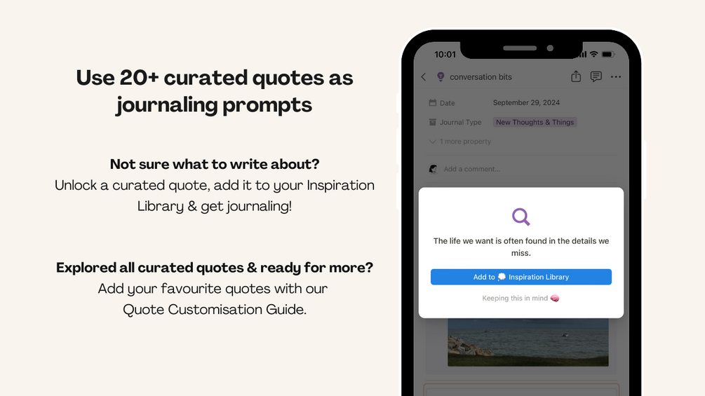 📝 24 Curated Inspiring Quotes (+ Customisation!): Stay inspired with hidden quotes in this journal & personalise them with the Quote Button Customisation Guide.