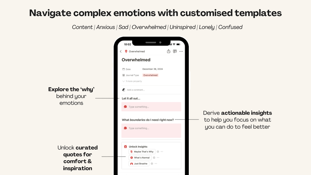 ✍️ 7 Emotion Journaling Templates: Reflect deeply with highly targeted journaling prompts for a wide range of daily emotions (Content, Overwhelmed, Anxious, Sad, Uninspired, Lonely, and Confused).